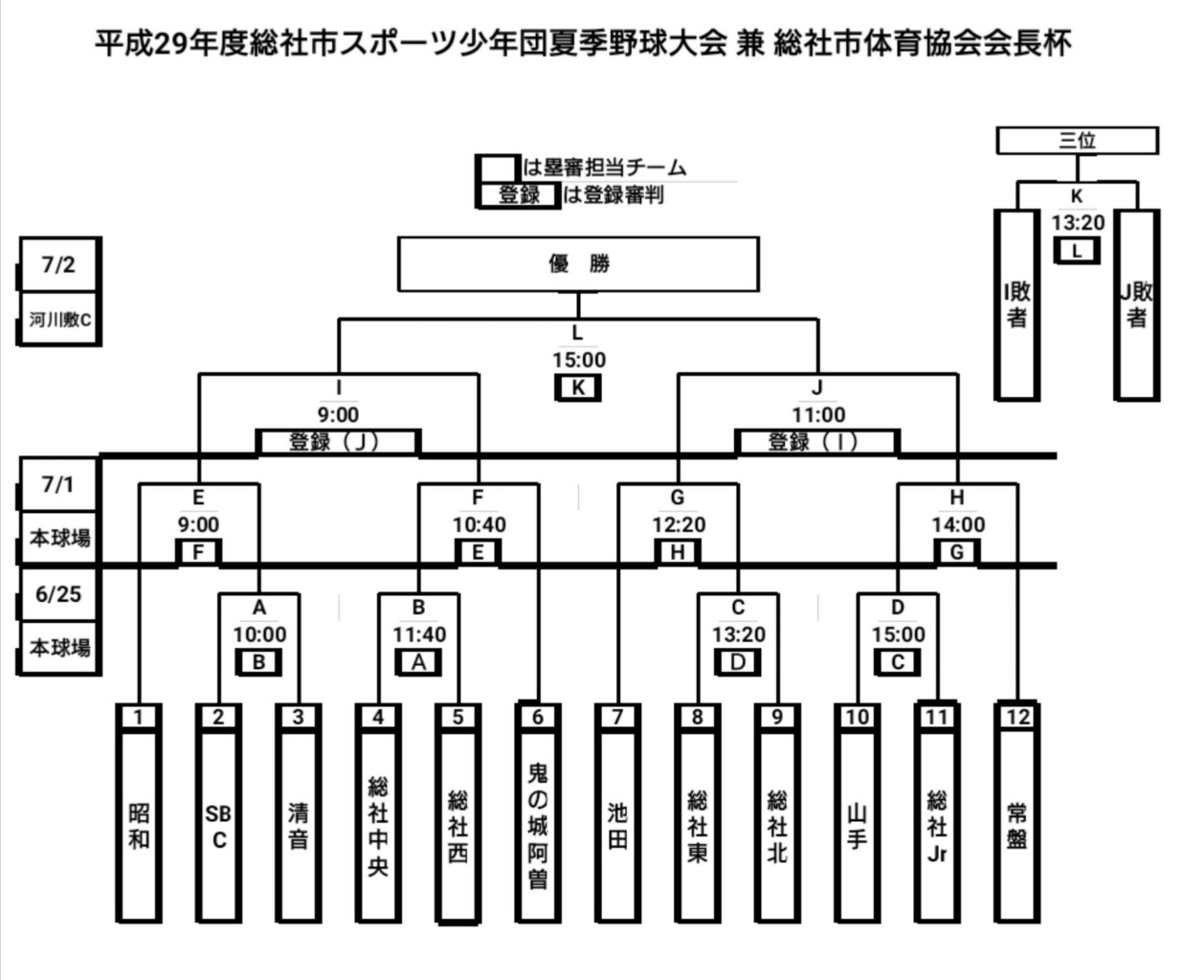 平成29年度総社市スポーツ少年団夏季野球大会兼総社市体育協会会長杯組合せ