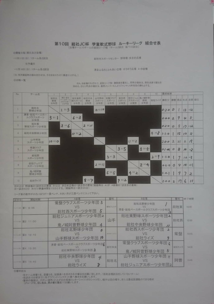 11月11日(日)総社市営球場と多目的広場を会場に第10回総社JC杯学童軟式野球ルーキーリーグが開催されました。
